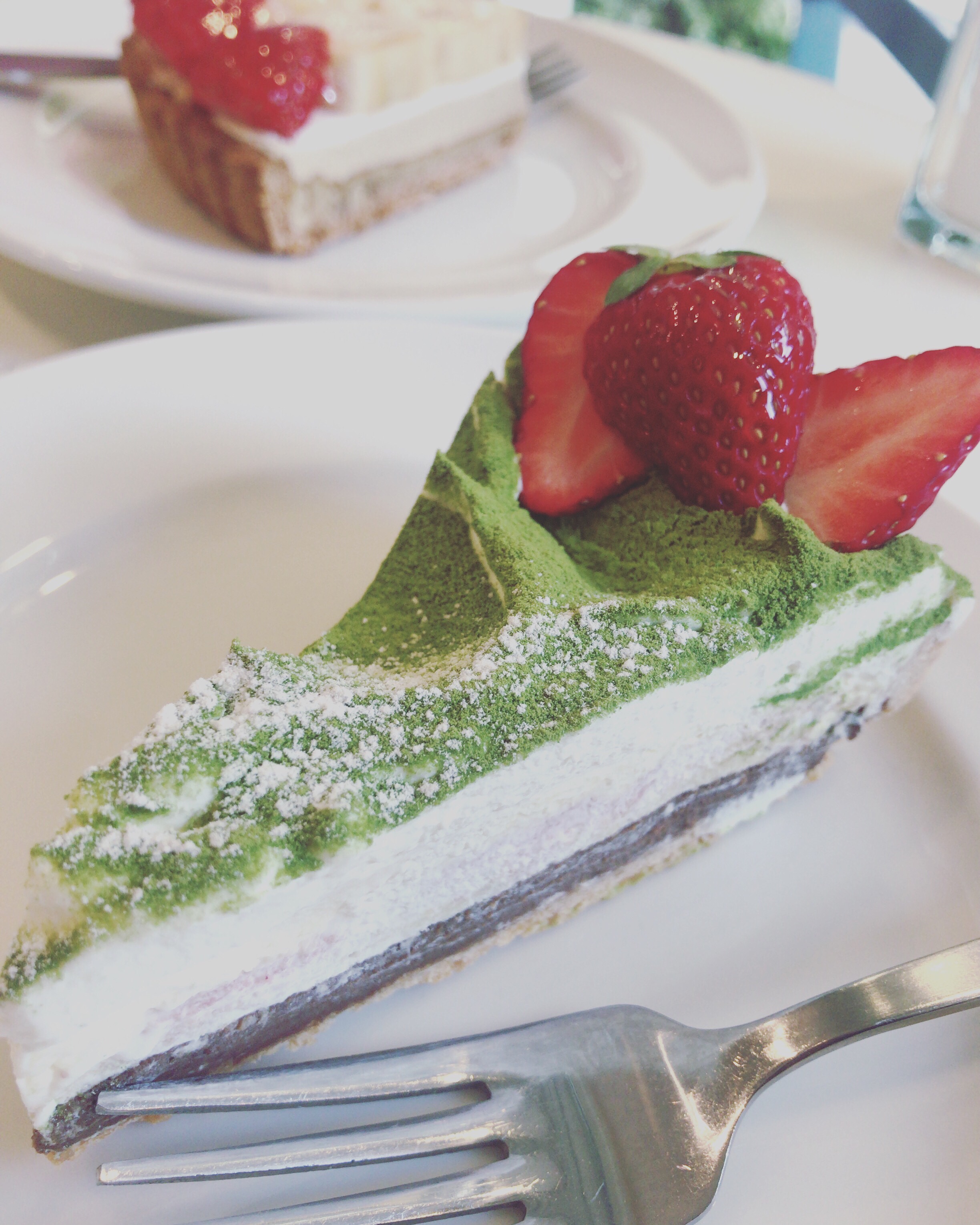 仕事終わって一息。抹茶のティラミスですって🍰ゴルフコースみたいなケーキ。