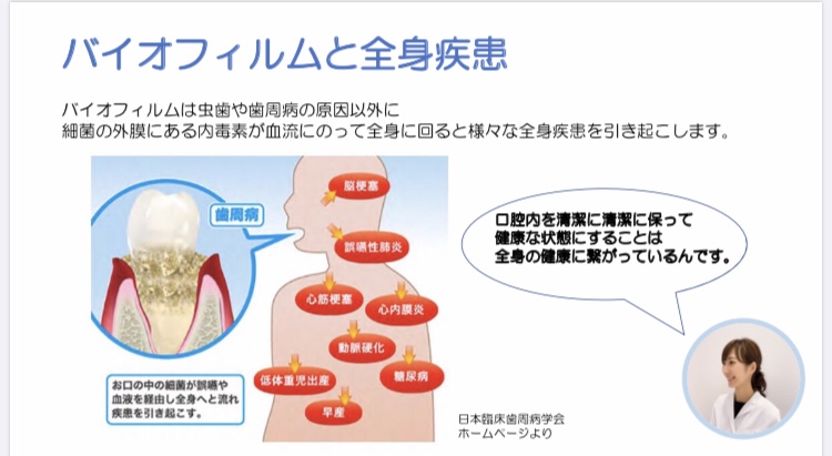 お家でできるセルフケアの代表『歯磨き』でバイオフィルム(プラーク、歯垢)をとることは全身疾患の予防になるんです。‬