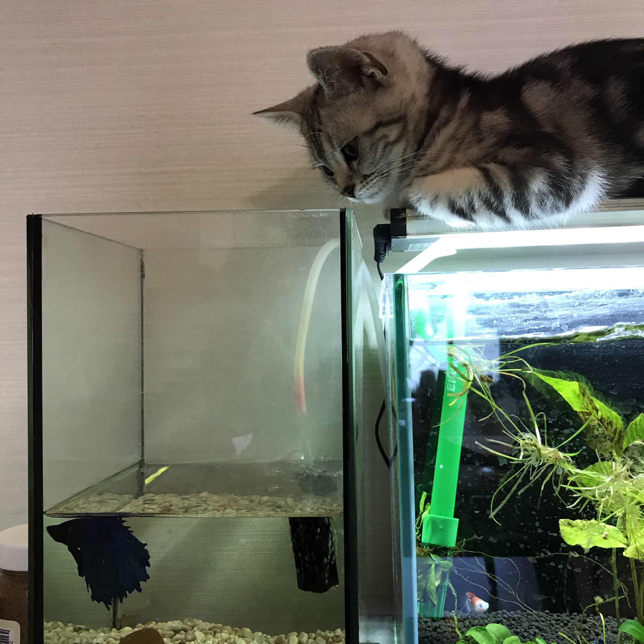 ベタの珠魅ちゃんをじーーーっと見つめるSammy🐱