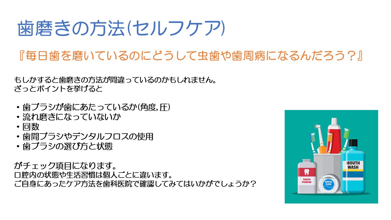 もしかすると歯磨きも自己流になってしまっているのかもしれません。磨いてると磨けてるは違いますから、、もしそうだとしたら勿体ないですよね。
