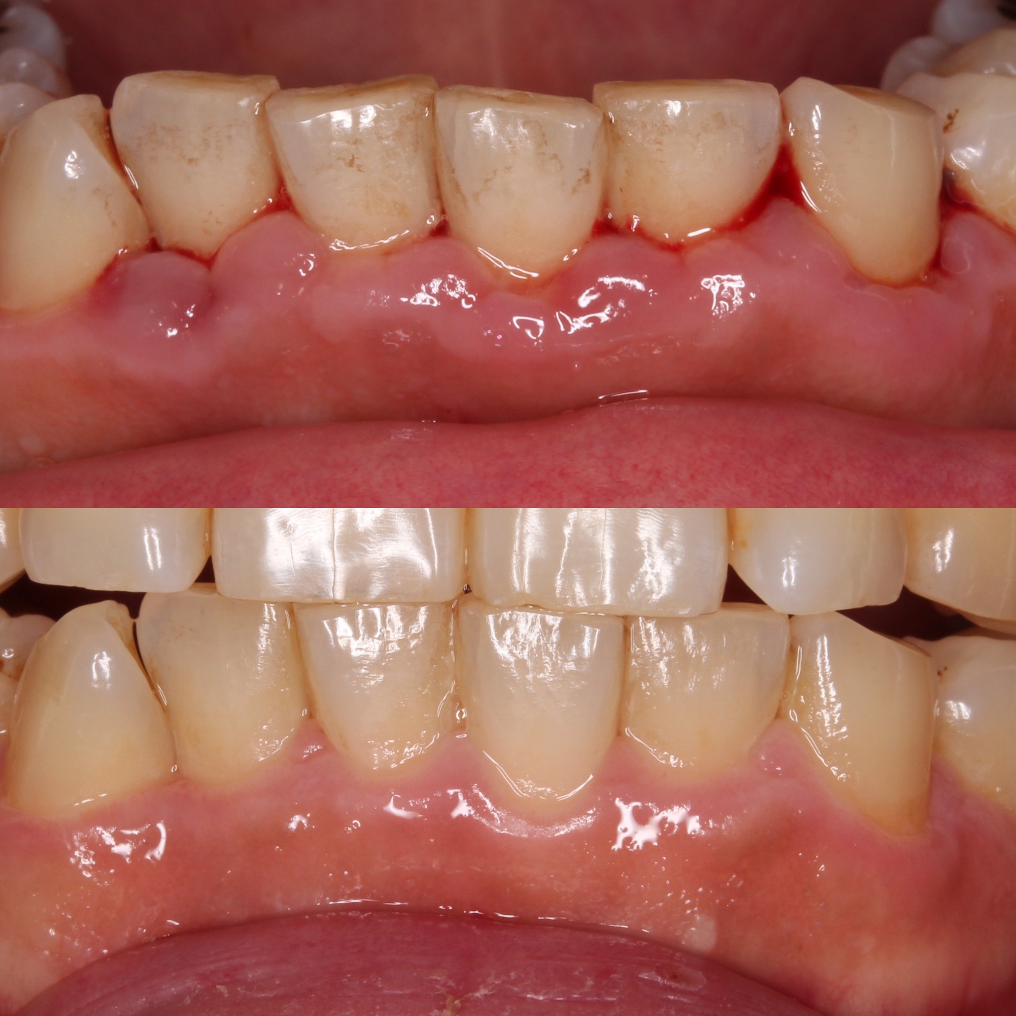 写真・30代男性。下顎前歯部に顕著な歯肉の腫れと出血が認められた。歯周病治療と併せて正しい歯磨きを実践してもらい治癒。