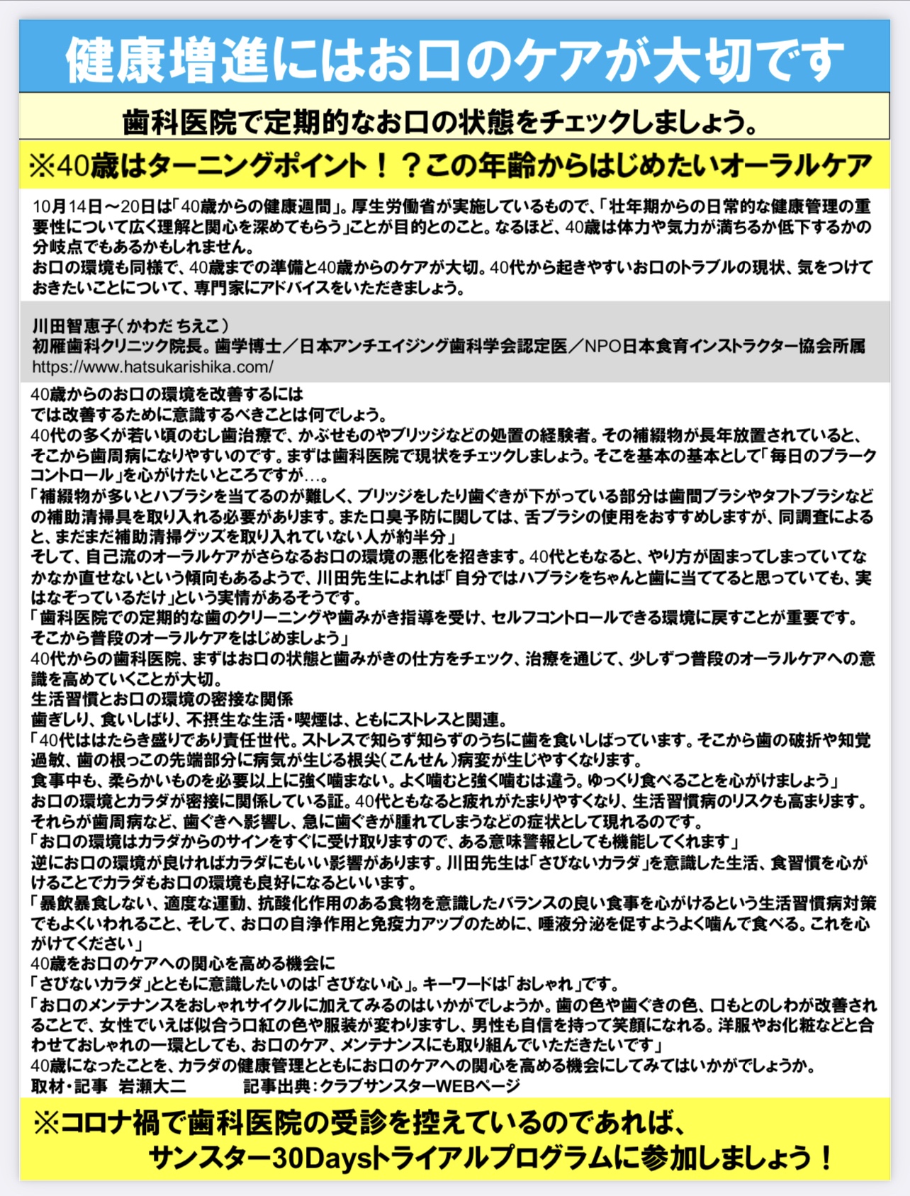 昨年、クラブサンスターさんに寄稿した「40歳はターニングポイント!?この年齢からはじめたいオーラルケア」がご好評につき各種中国メディアや健康保険組合様にご活用いただけたとのご報告を受けました!