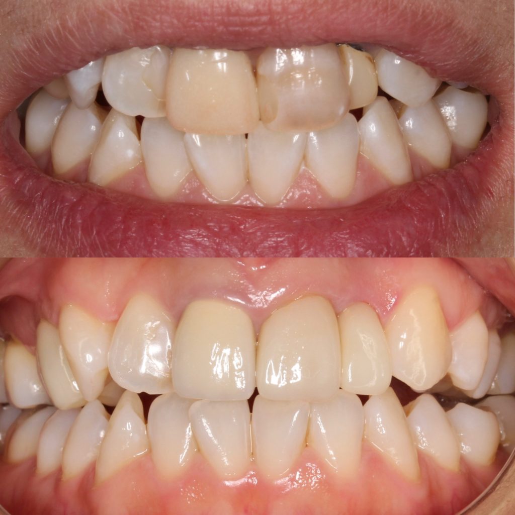 写真は50代女性『前歯の見た目が嫌』。前歯3本をセラミック治療しました。元々引っ込んでいる左上2番は仮歯で歯肉の形を整え、セラミッククラウンの装着時に自然に生えて見えるように工夫しています。