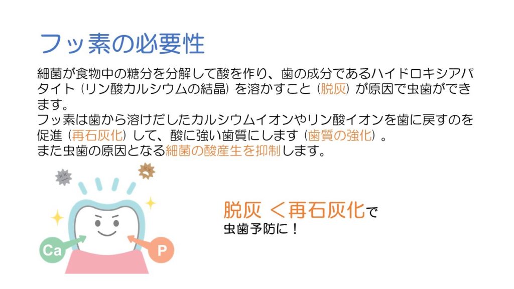 フッ素は、毎日の飲食で歯が溶ける(脱灰)のを予防する働き『再石灰化・歯質の強化』があり、虫歯予防きは欠かせない成分です。市販の歯磨き剤にはほぼ含まれています。