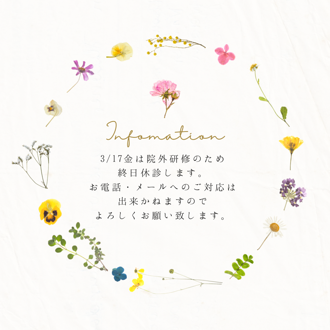 臨時休診のお知らせです。3/17金曜日は院外研修のため終日休診致します。お電話やメールへのご対応は出来かねます。