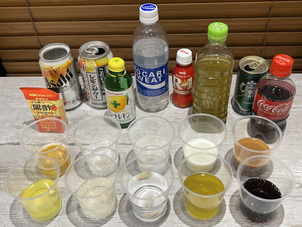 今回、実験に用いた飲料水は以下のものになります。A:コーラ B:乳酸菌飲料 C:東京の水道水 D:レモン飲料 E:黒酢 F:ミルク砂糖入りコーヒー G:緑茶 H:スポーツドリンク I:レモンサワー J:ビール