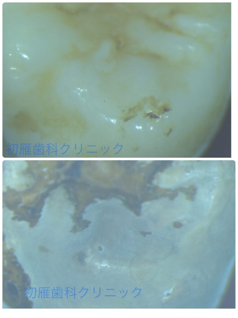 一番脱灰が目立ったコーラをマイクロスコープで拡大し観察すると、カラメル色素による着色と歯面が粗造になっています。また、元々脱灰していた部分は脱灰が進行し、ところどころ穴が認められます。