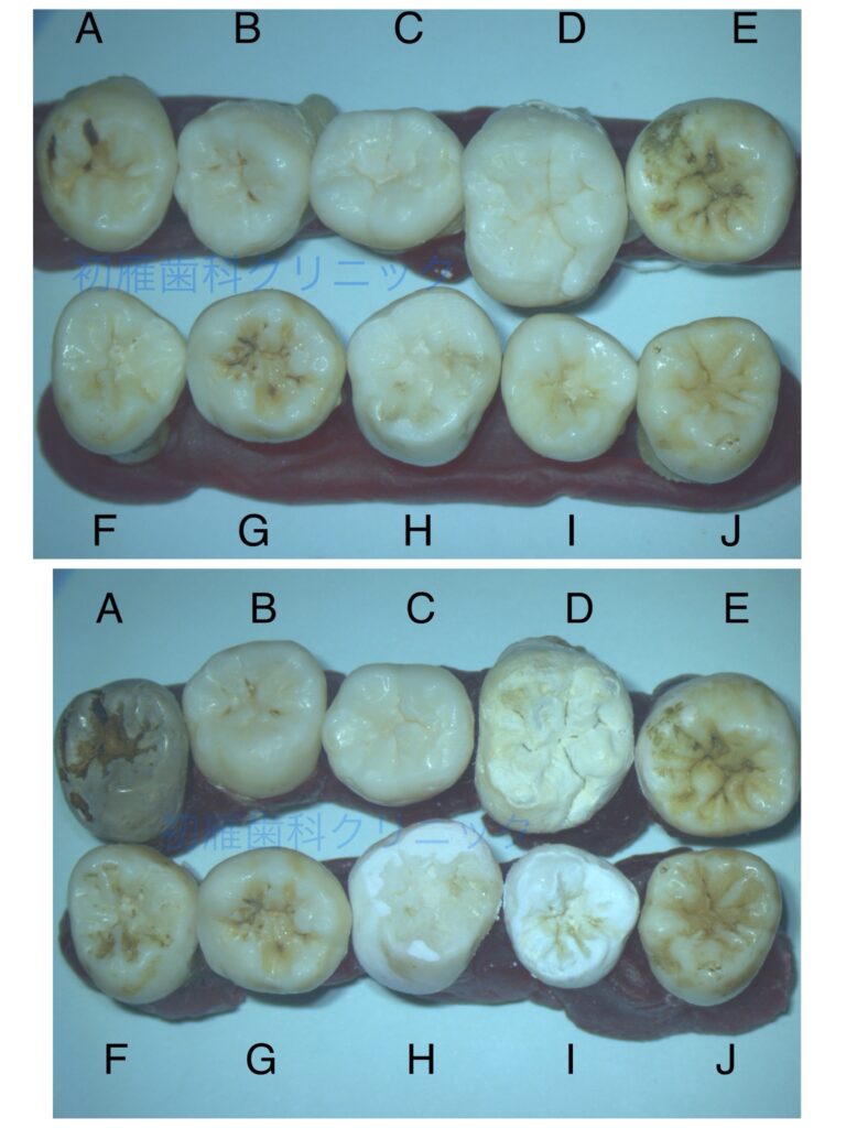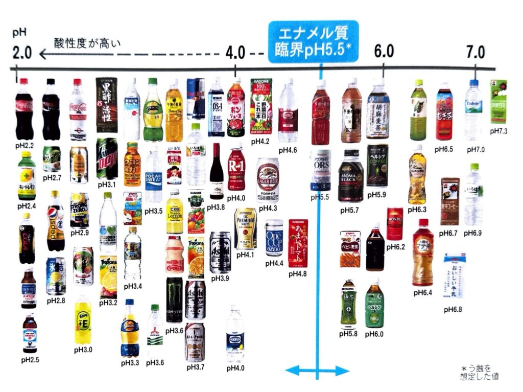 以上より、細菌がなくても歯が溶け始めるエナメル質の臨界pH5.5以下の酸性が強い飲み物ほど①歯を脱灰させる、②虫歯がある部分はさらに脱灰が進み歯質の崩壊が起きることが確認されました。