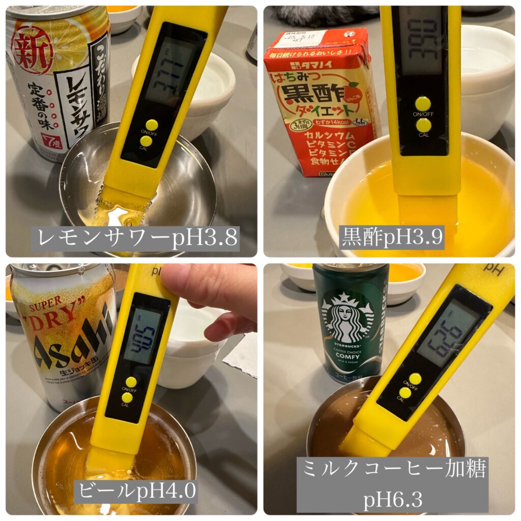 どうでしょうか?特に著しく変化が認められたのは、A:コーラpH2.2、D:レモン飲料水pH2.4、H:スポーツドリンクpH3.5、I:レモンサワーpH3.8です。