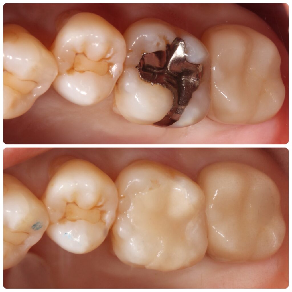 古い銀歯をセラミックに変えました。セラミック治療は白い歯になるだけではなく、金属アレルギーが心配な方におすすめの治療法です。