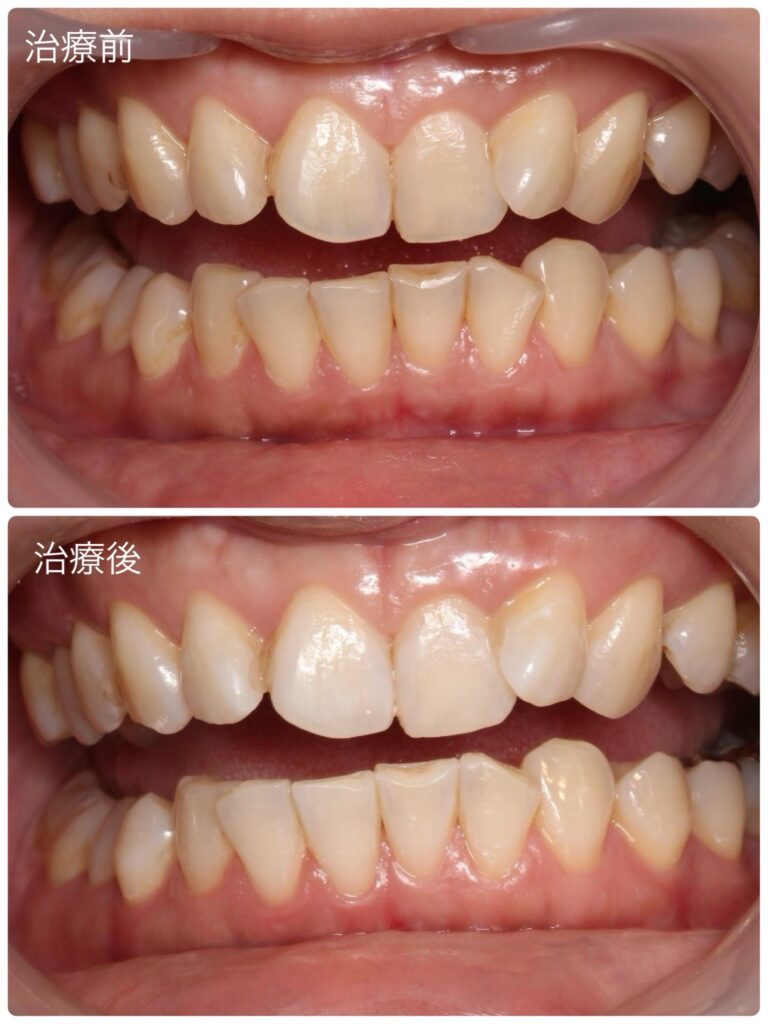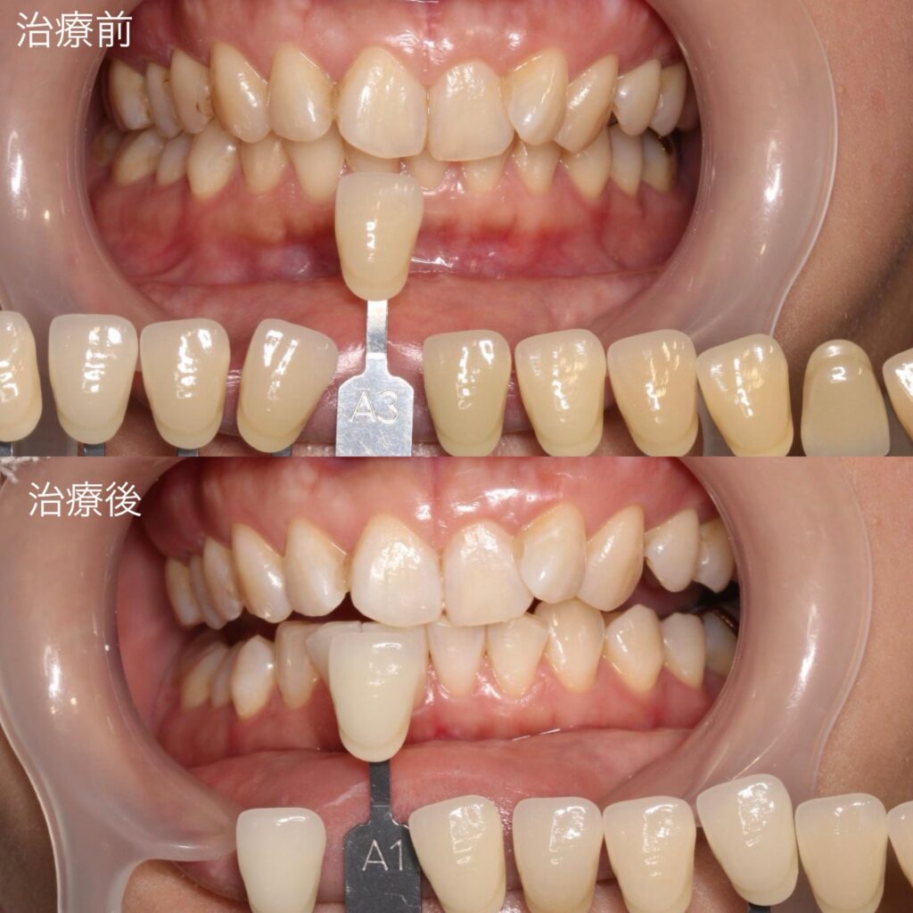 全体の歯を明るくするために、オフィスホワイトニングを行いました。神経のない左上の前歯は、ウォーキングブリーチを兼ねた特殊な方法で行いました。